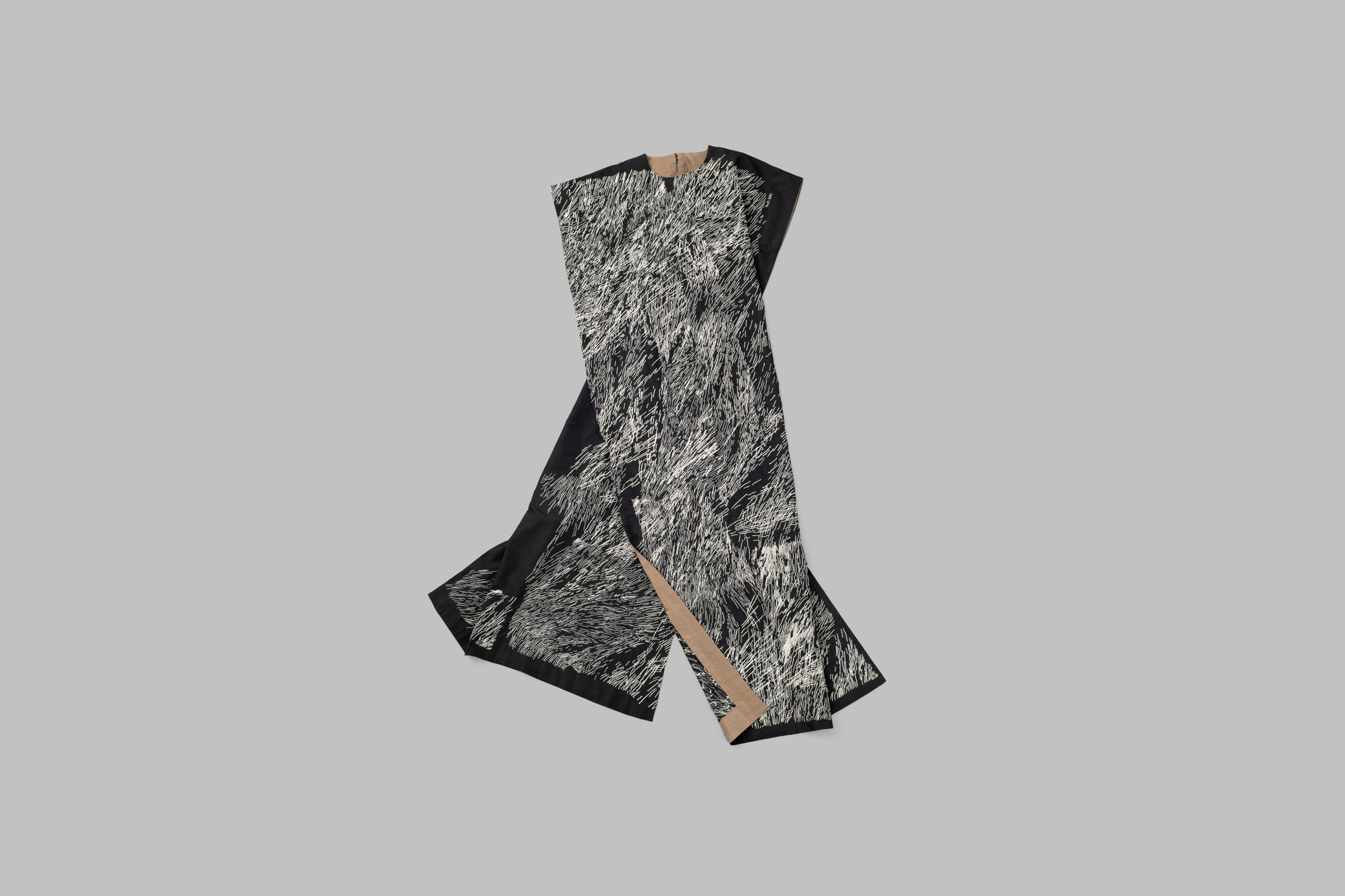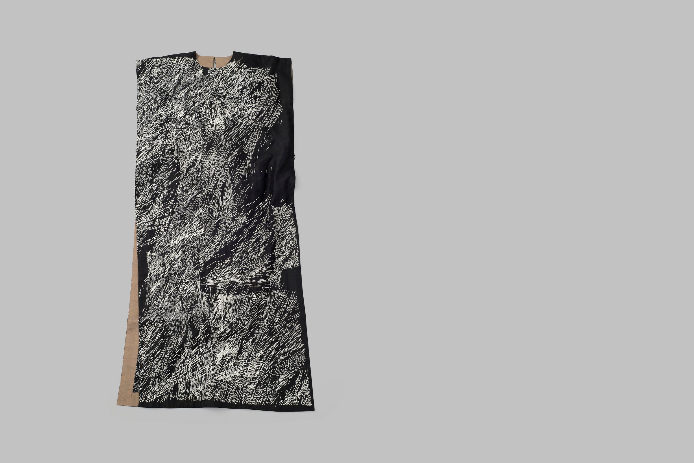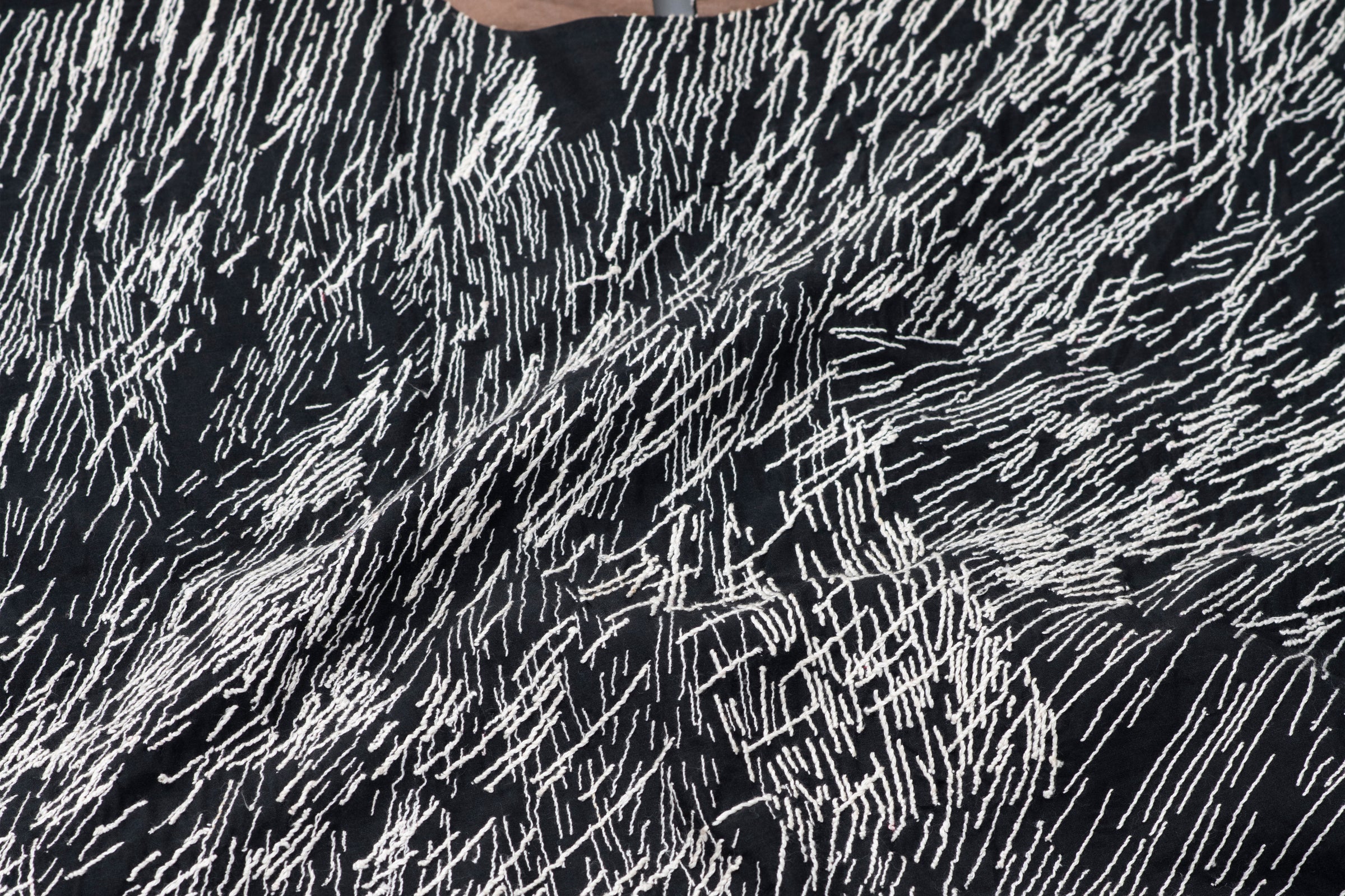 Black silk-cotton fabric, meticulously embroidered in fine cotton yarn mirrors nature’s dance. Play with thread thickness and intensity create rich texture and supple weight, enhancing graceful fall, while the intricate surface balances precision with organic movement for a dynamic, luxurious piece.