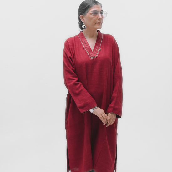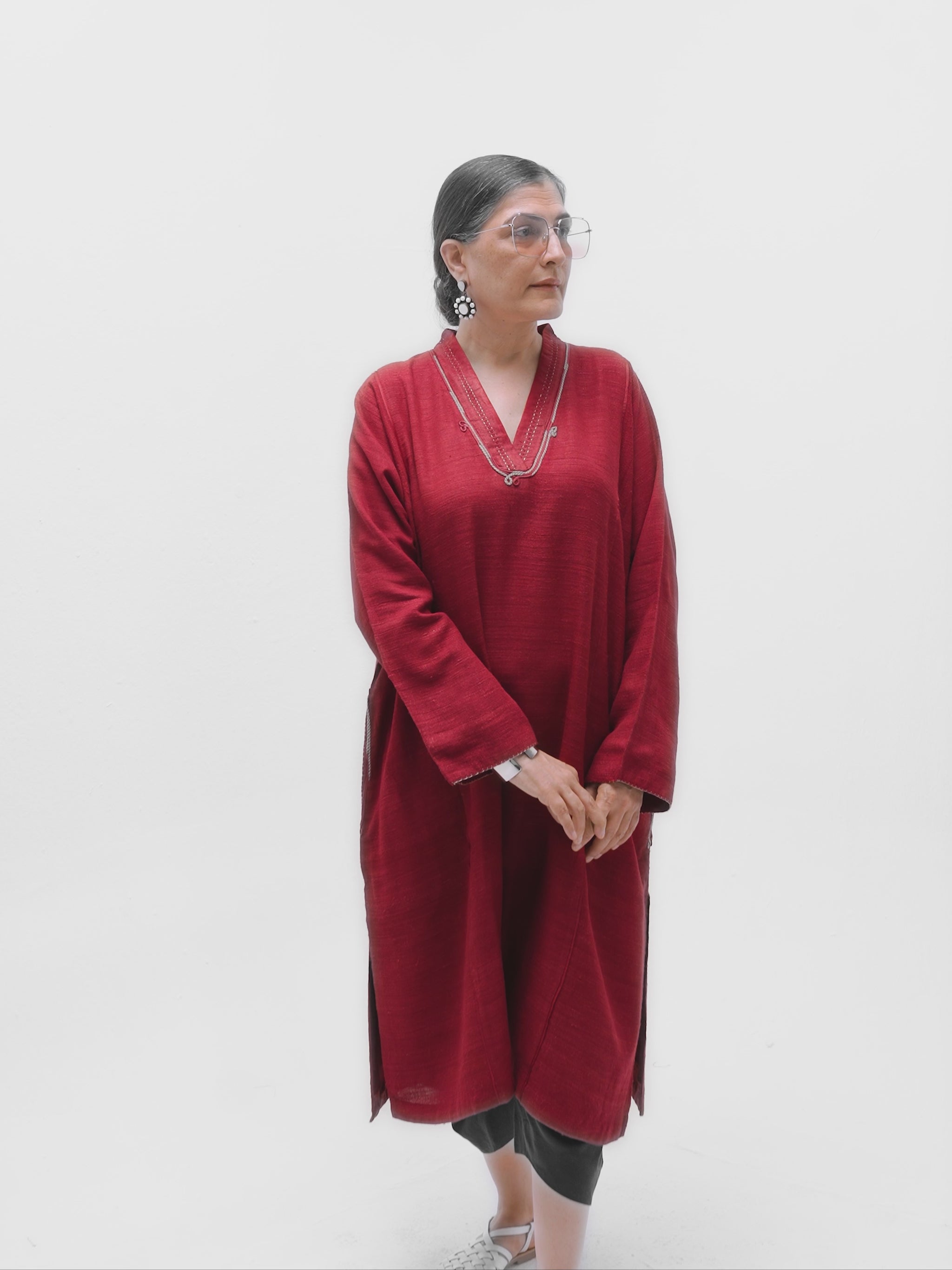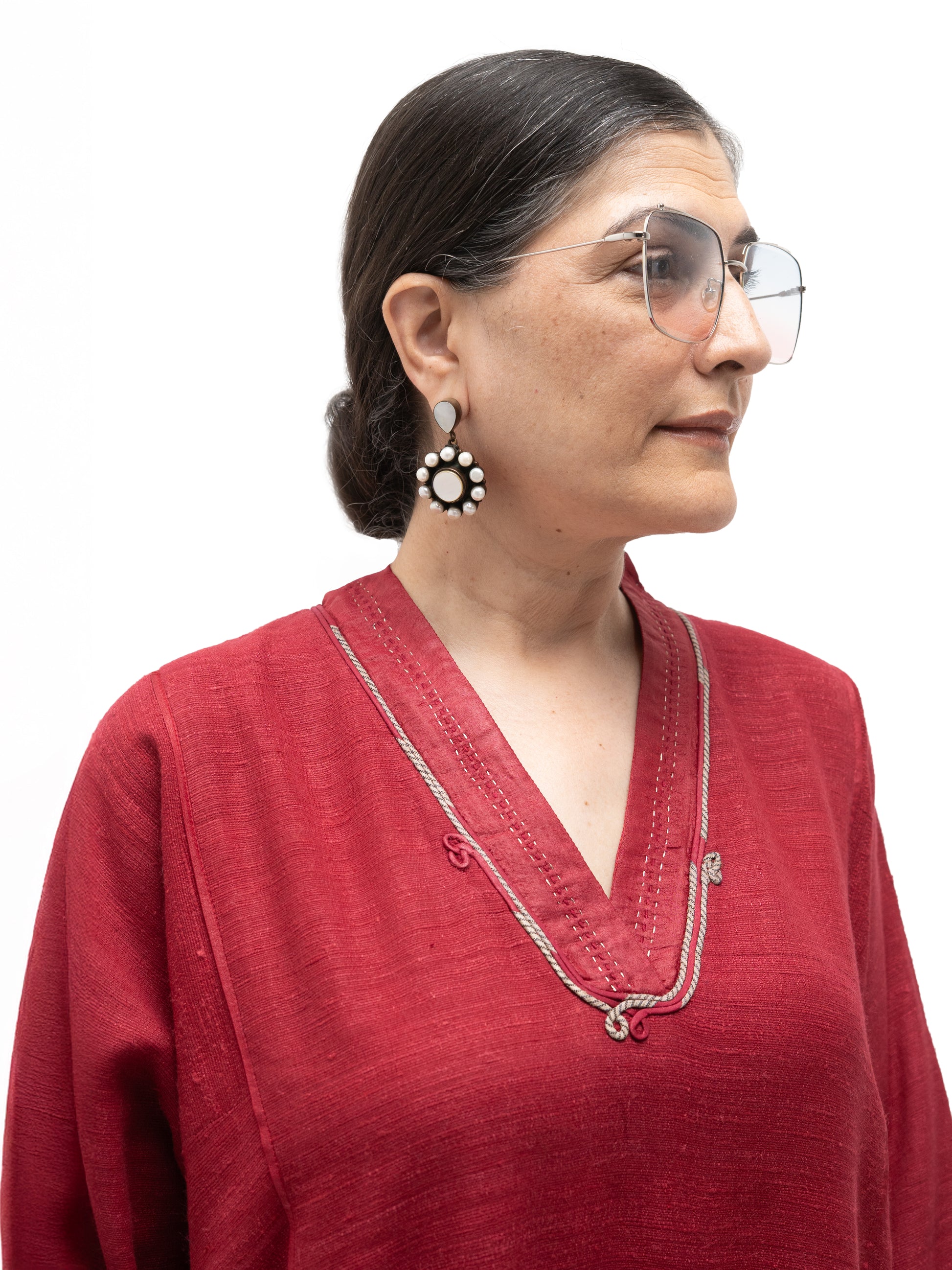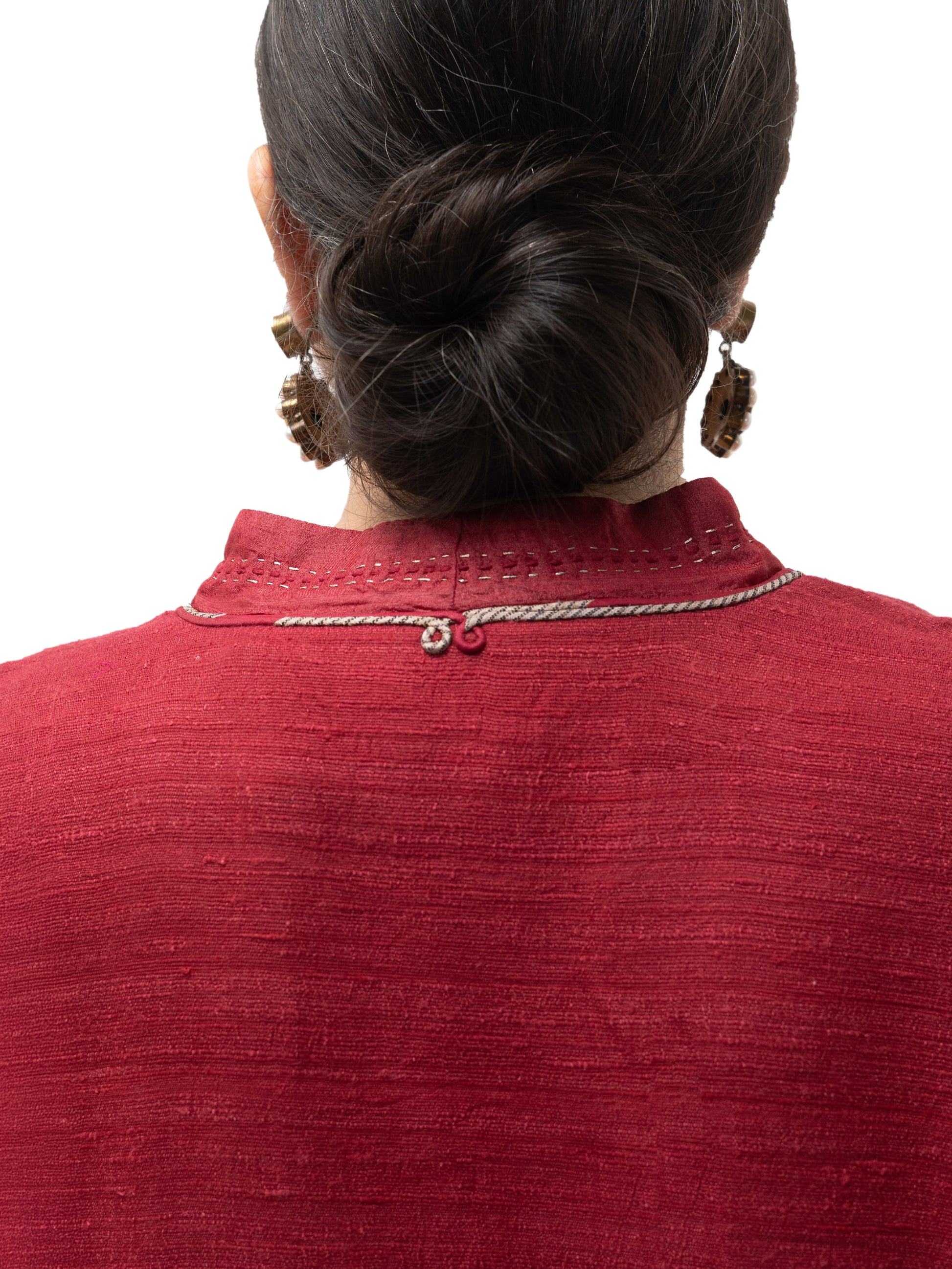 Delicate hand-embroidered running stitches in cotton thread and zari trace the tussar silk neckline and sleeves, adding subtle detail to this silk–cotton blend feron with its natural raw texture and distinctive fall. Hand embroidered dori detail around the neckline and the pockets further accentuates the feron.