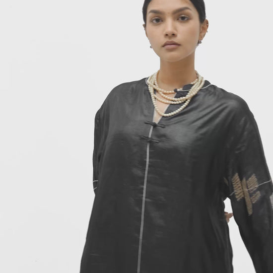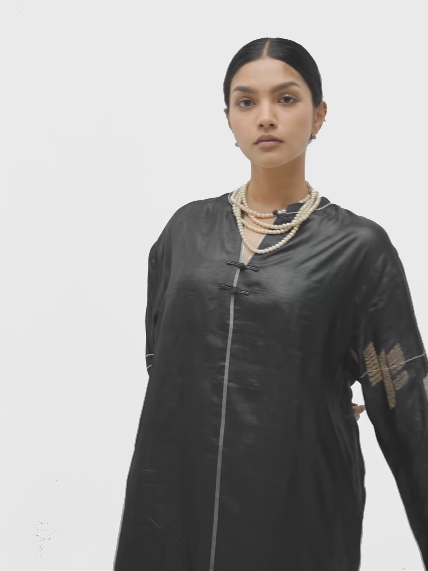 Crafted from supple, lightweight tussar silk, this straight tunic is versatile luxury—perfect as formal attire or elevating everyday chic. Paired with our ribbed capri pants with stitch details in silk cotton, it creates a distinctive statement ensemble .