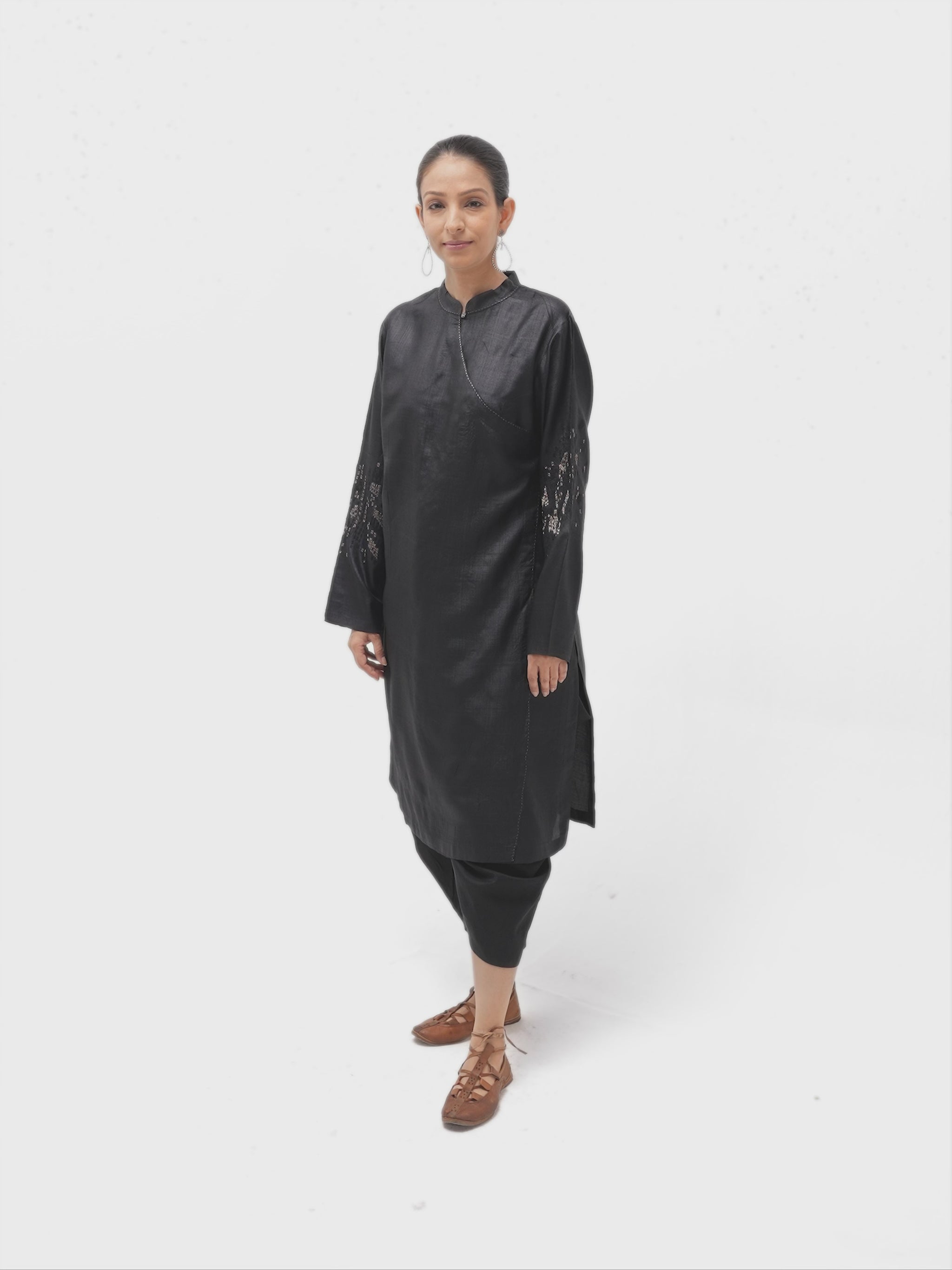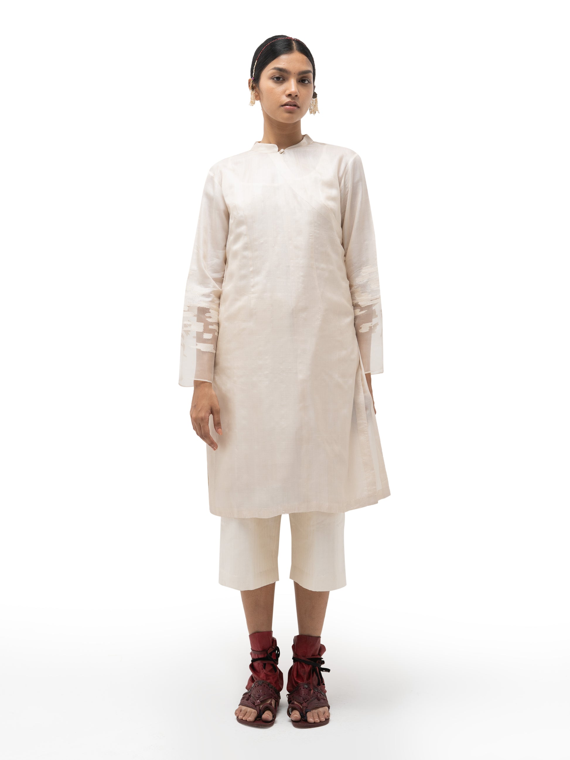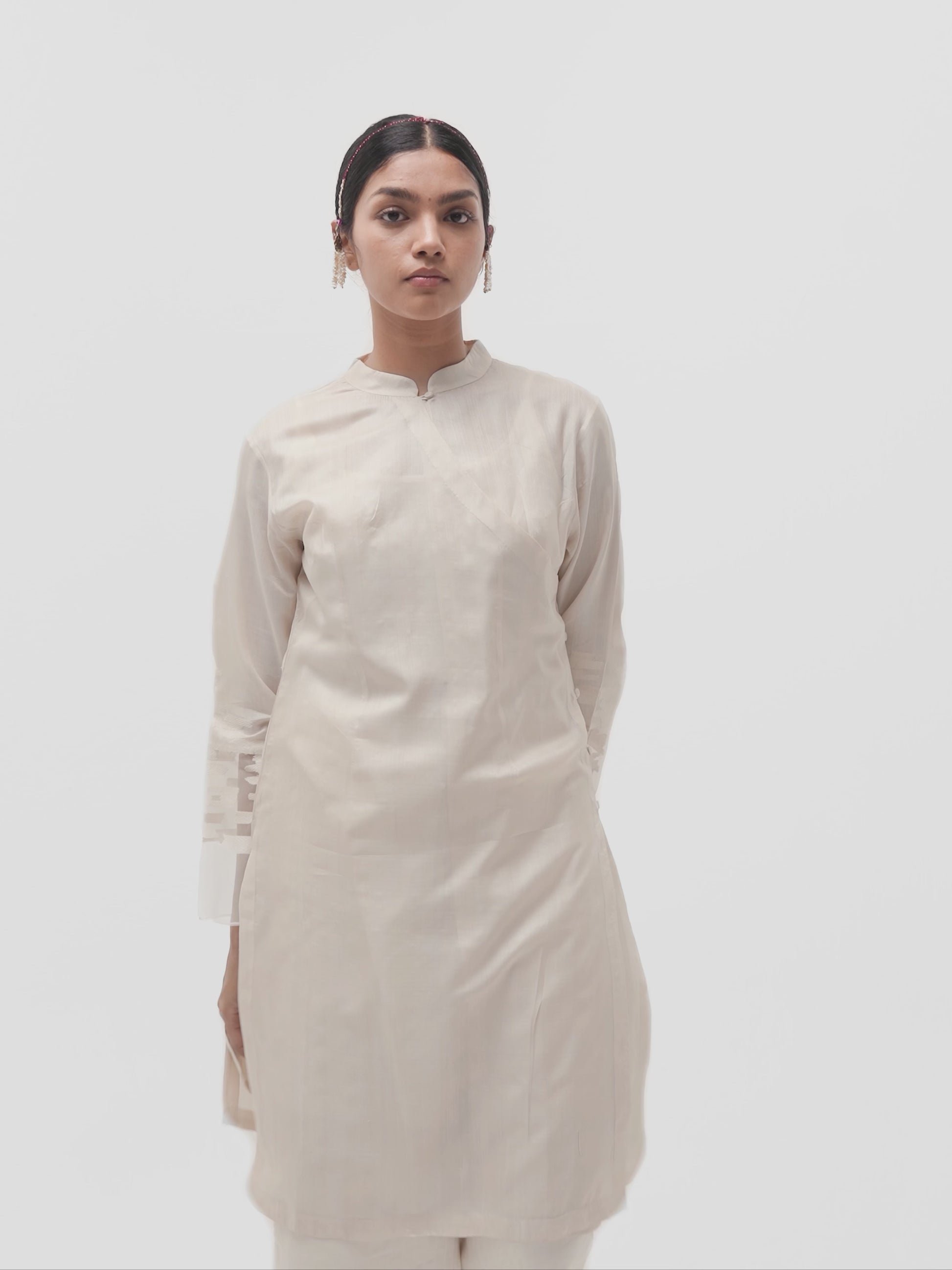 Crafted from supple, lightweight tussar silk, this overlap tibetan tunic is versatile luxury—perfect as formal attire or elevating everyday chic. Paired with our salwar pants in silk cotton, it creates a distinctive ensemble ideal for intimate gatherings.