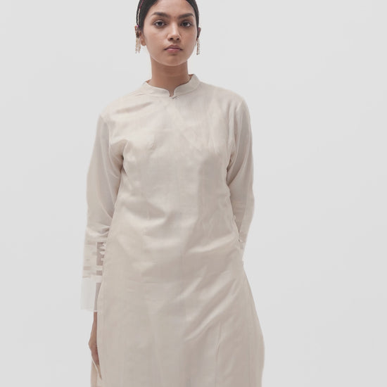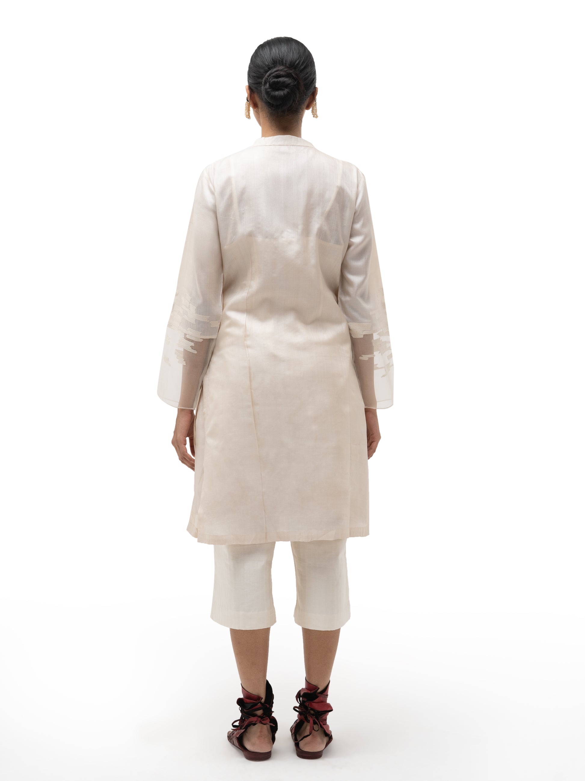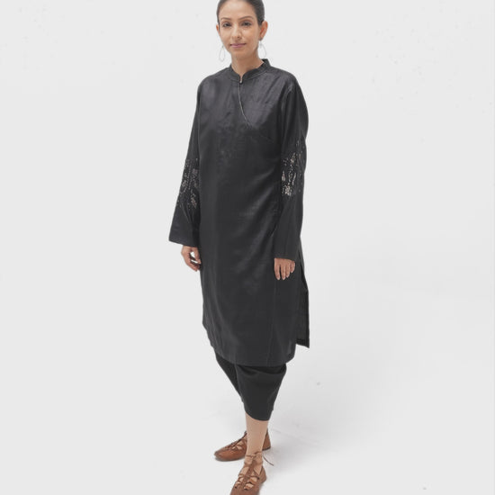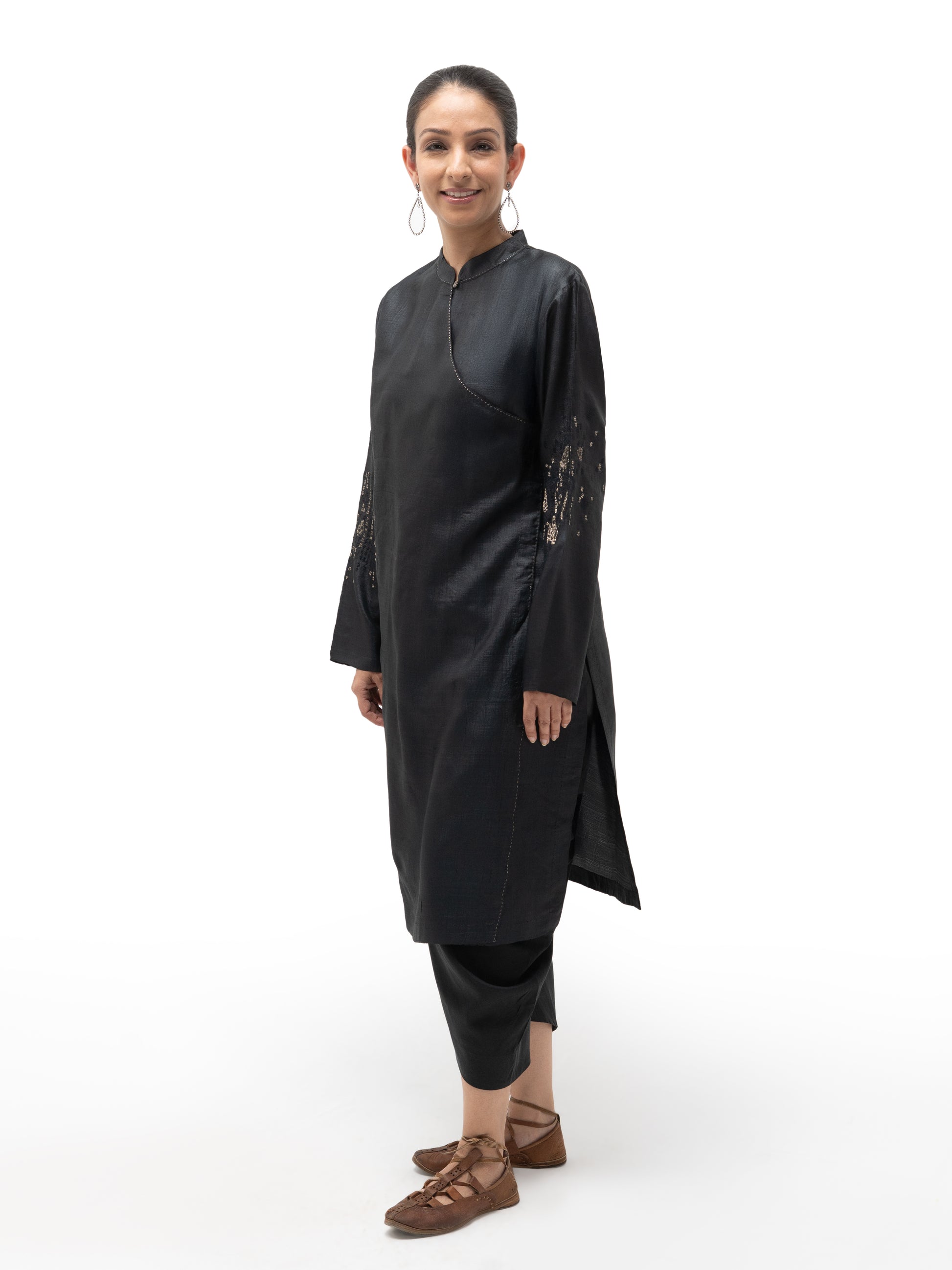Crafted from supple, lightweight tussar silk, this overlap tibetan tunic is versatile luxury—perfect as formal attire or elevating everyday chic. Paired with our salwar pants in silk cotton, it creates a distinctive ensemble ideal for intimate gatherings.