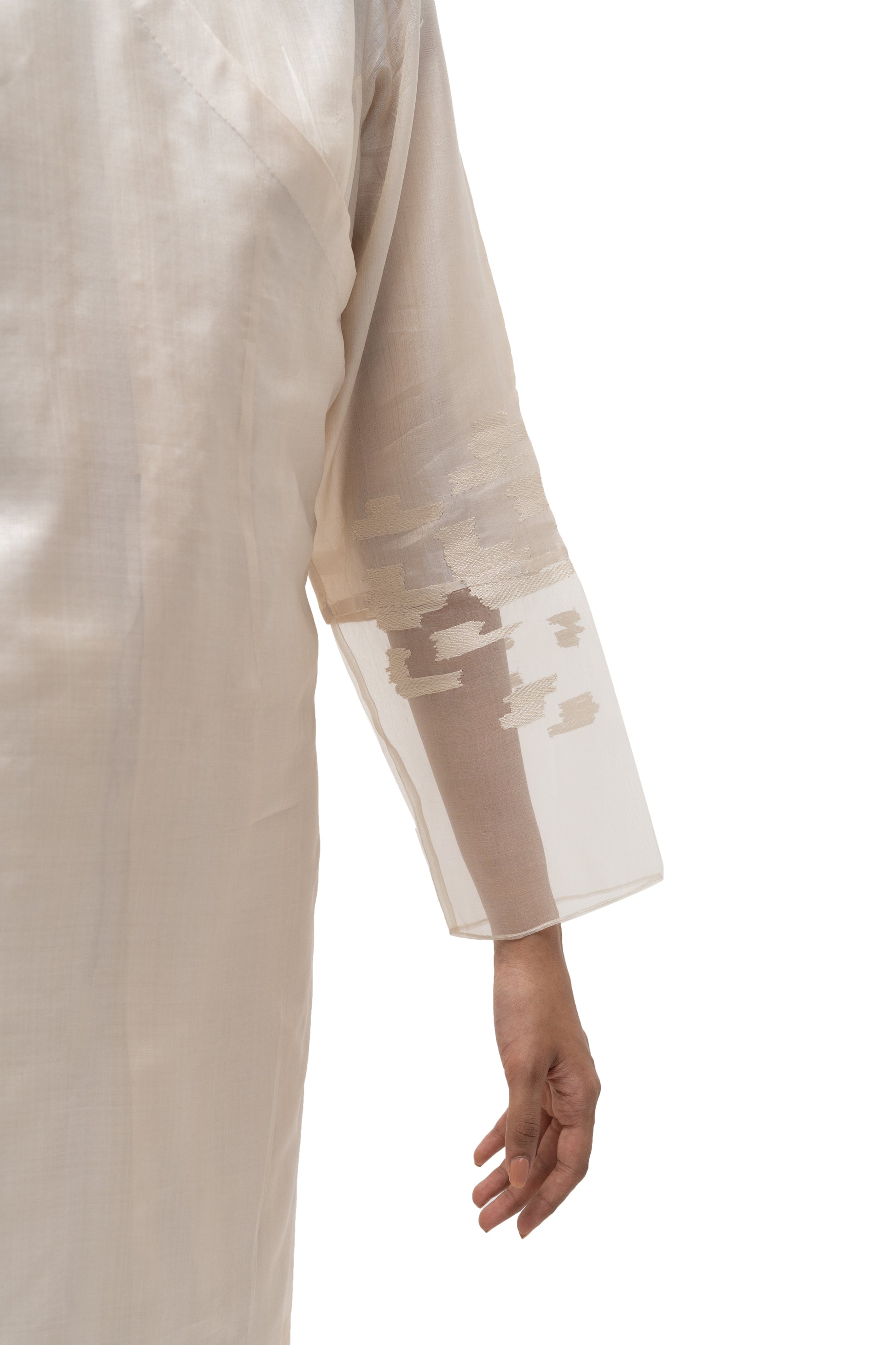 Sujani embroidery is reimagined in an abstract scattered block composition, delicately worked in cotton thread and zari in very fine stitches.
