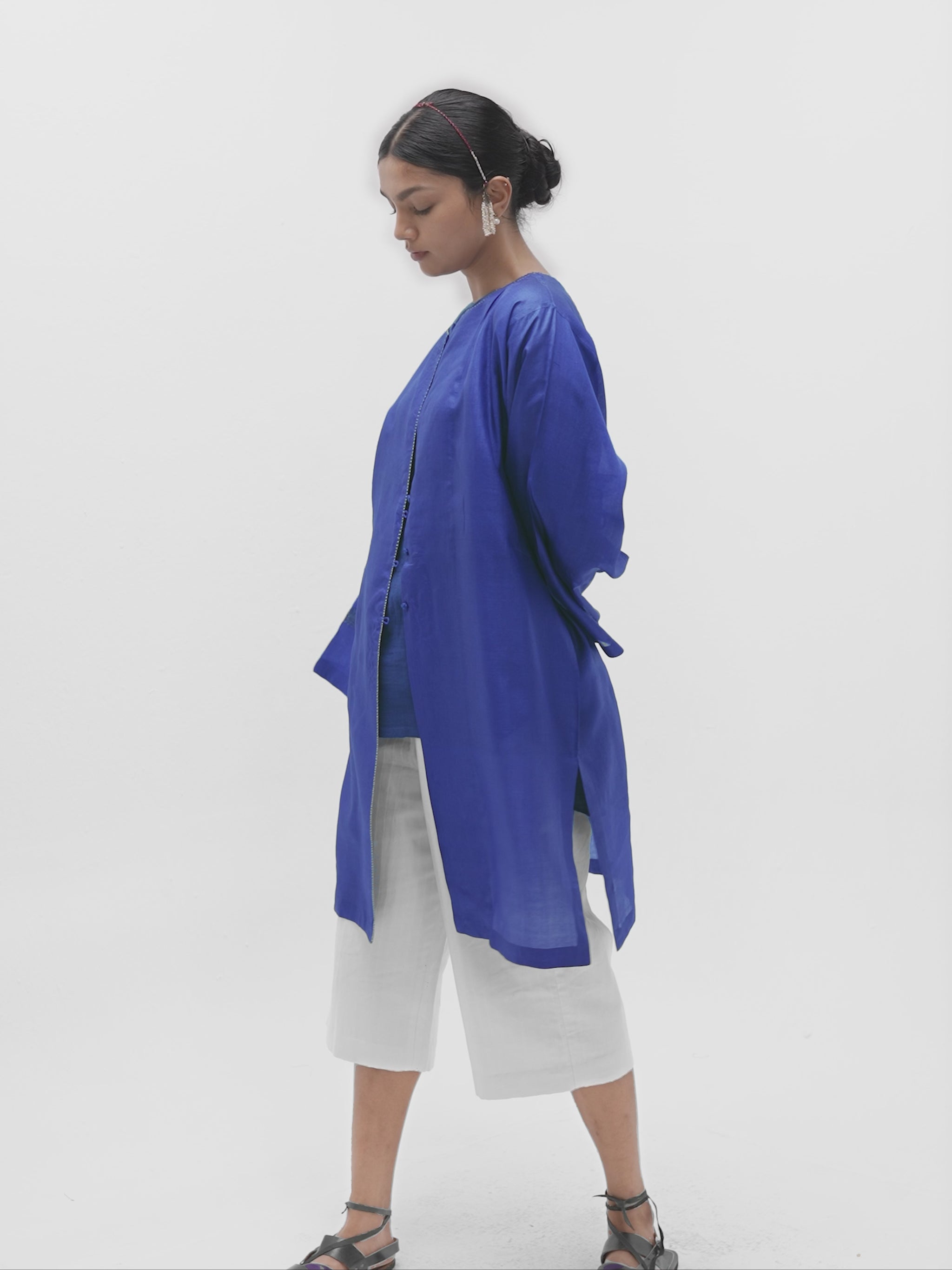 Crafted from supple, lightweight tussar silk, this unisize kimono jacket is a versatile luxury—perfect for layering over festive attire or elevating everyday chic. In this set, paired with our indigo gicha silk top, it creates a distinctive ensemble ideal for intimate gatherings.