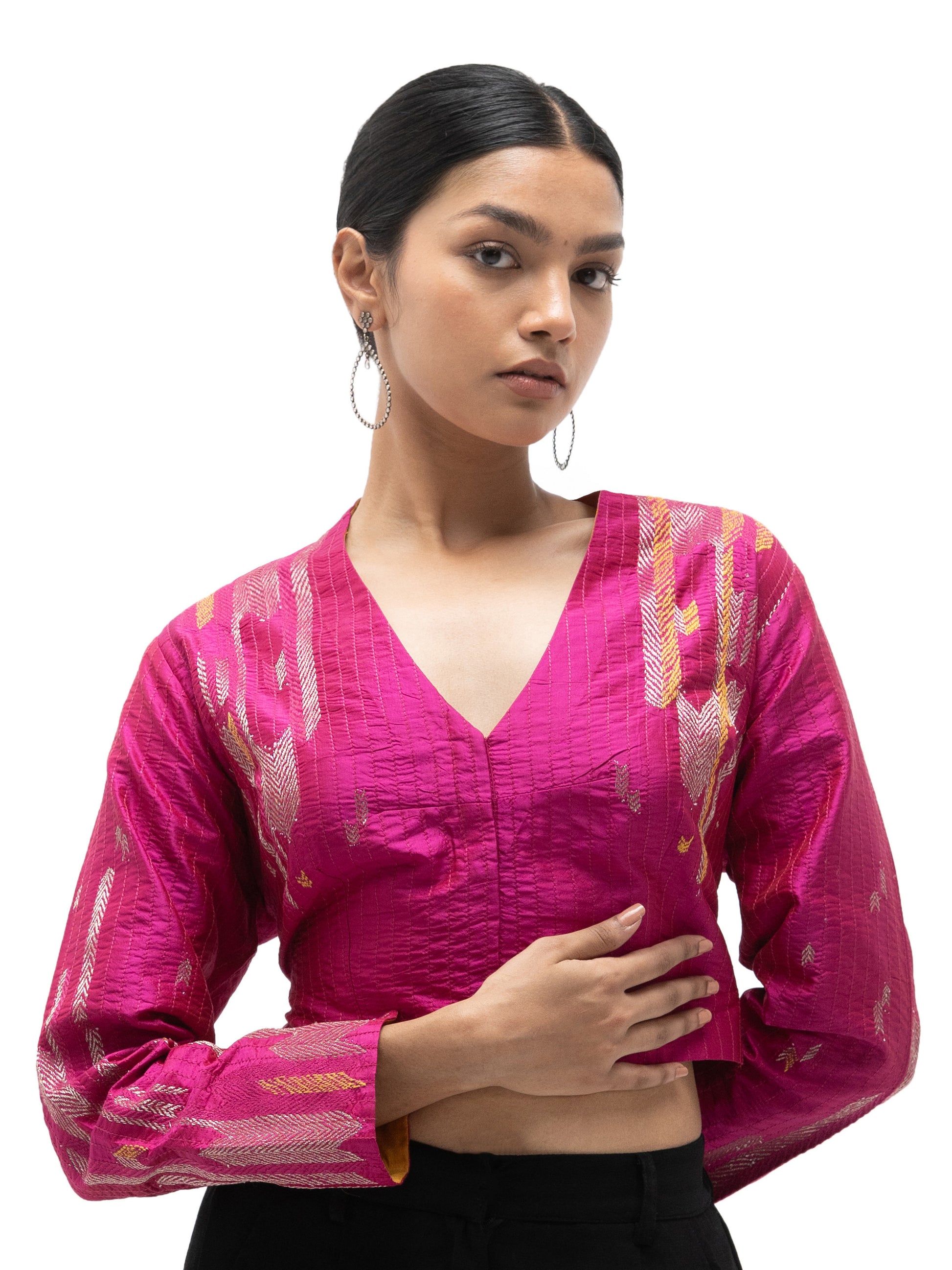 Hand Embroidered Silk Blouse with Stitch Details – Pink