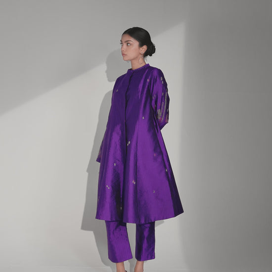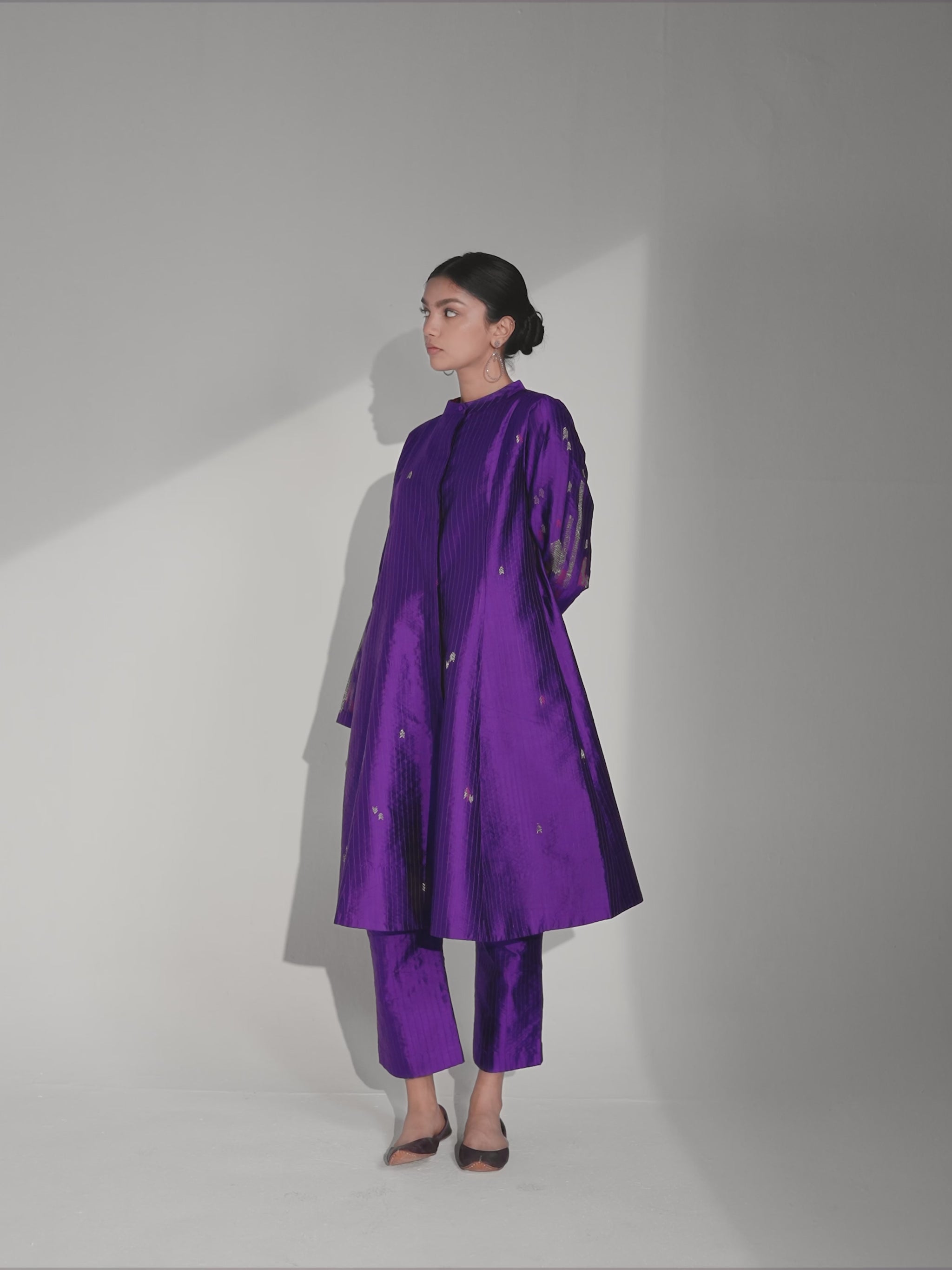 Hand Embroidered Silk Flared Tunic with Stitch Texture – Purple