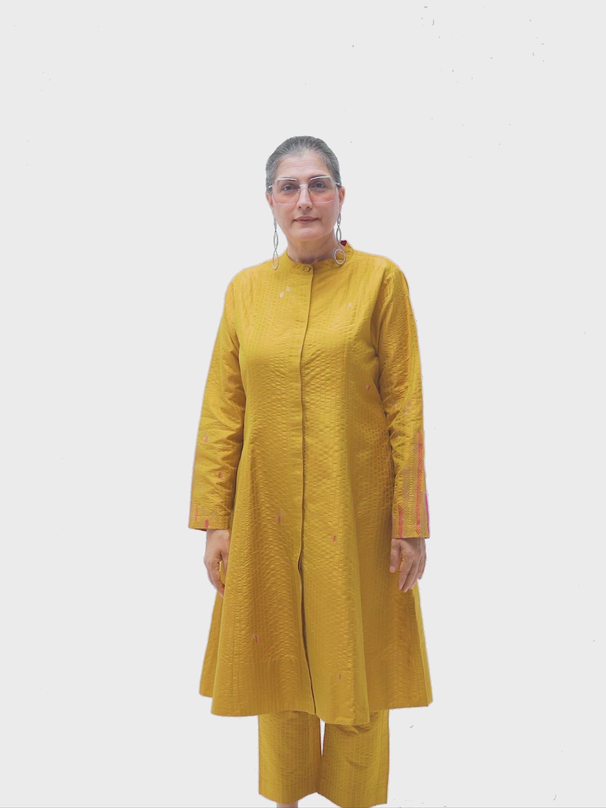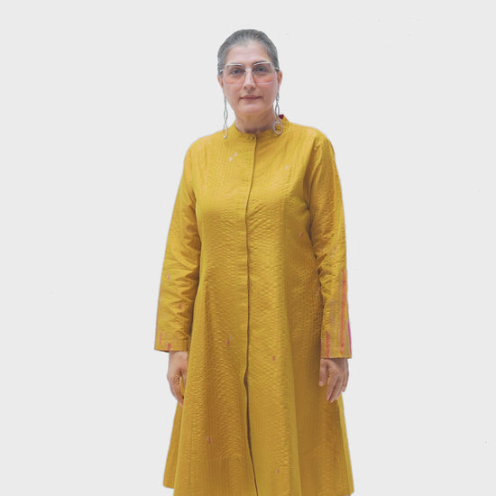 Hand Embroidered Silk Flared Tunic with Stitch Texture – Yellow