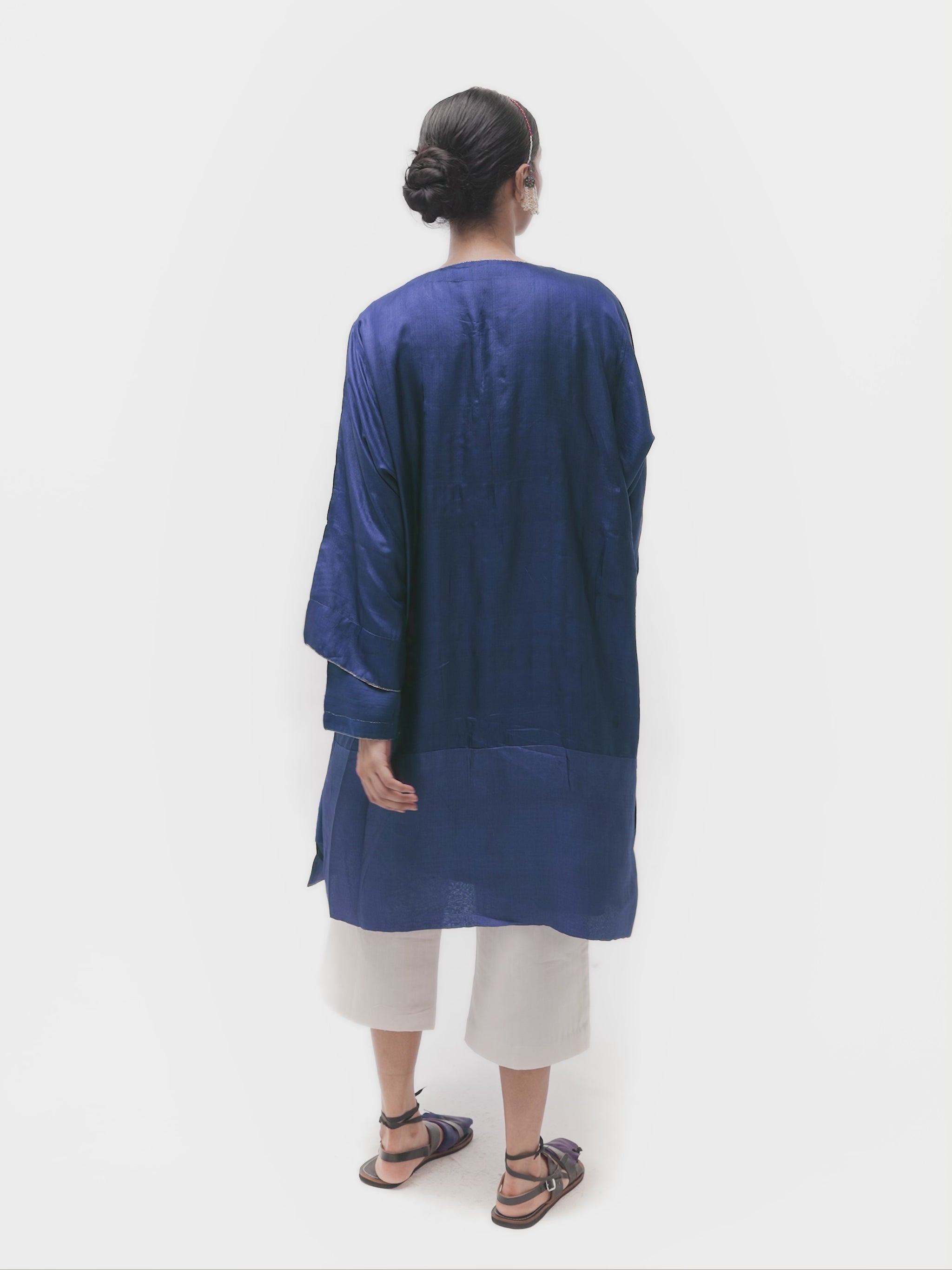 Crafted from supple, lightweight tussar silk, this kimono jacket is a versatile luxury—perfect for layering over festive attire or elevating everyday chic. Paired with our flared gicha silk tunic, it creates a distinctive ensemble ideal for intimate gatherings.