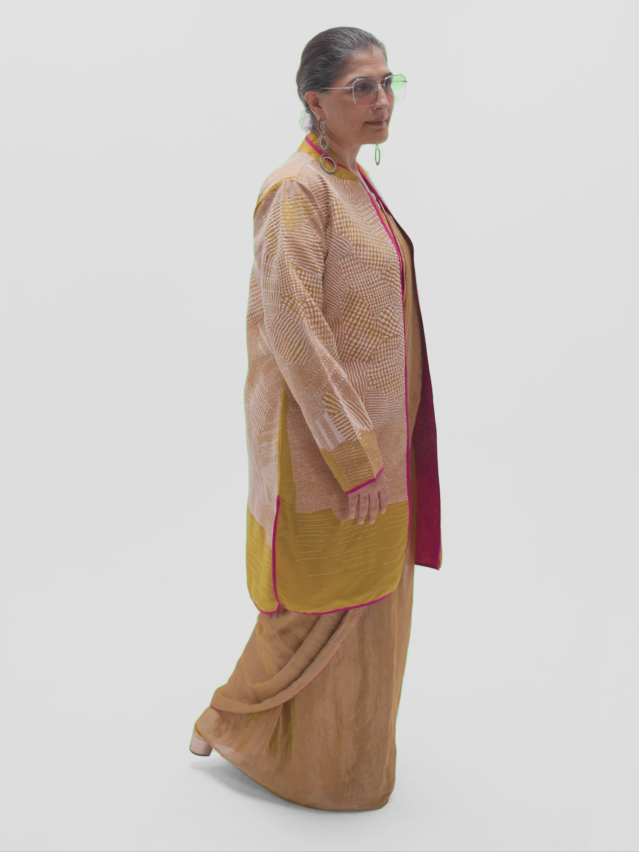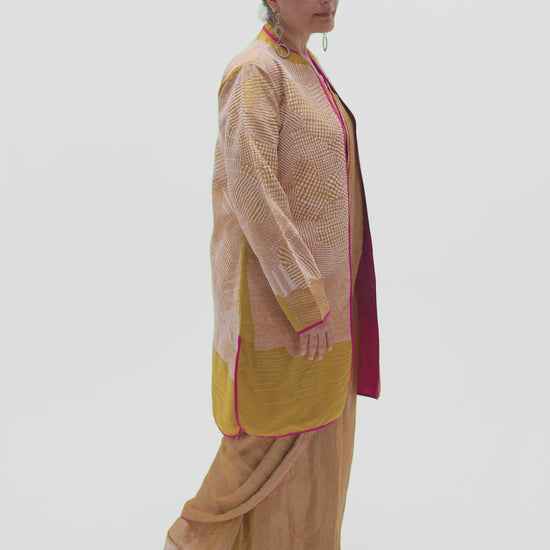 The timeless straight front open jacket is easy to style with sarees, pants and dresses alike.