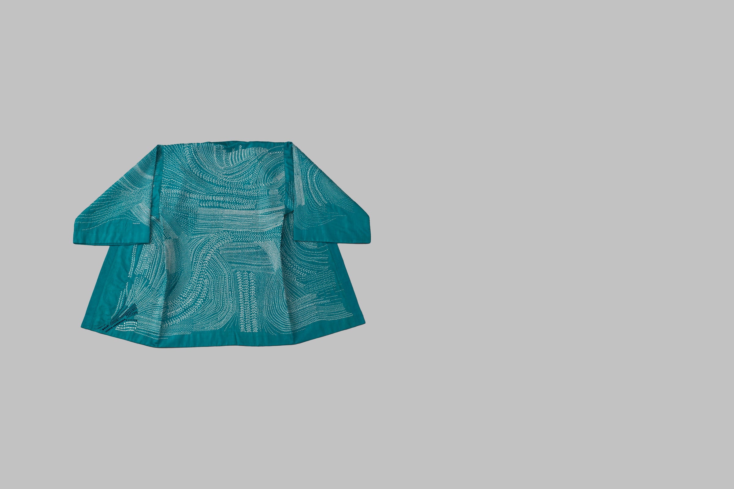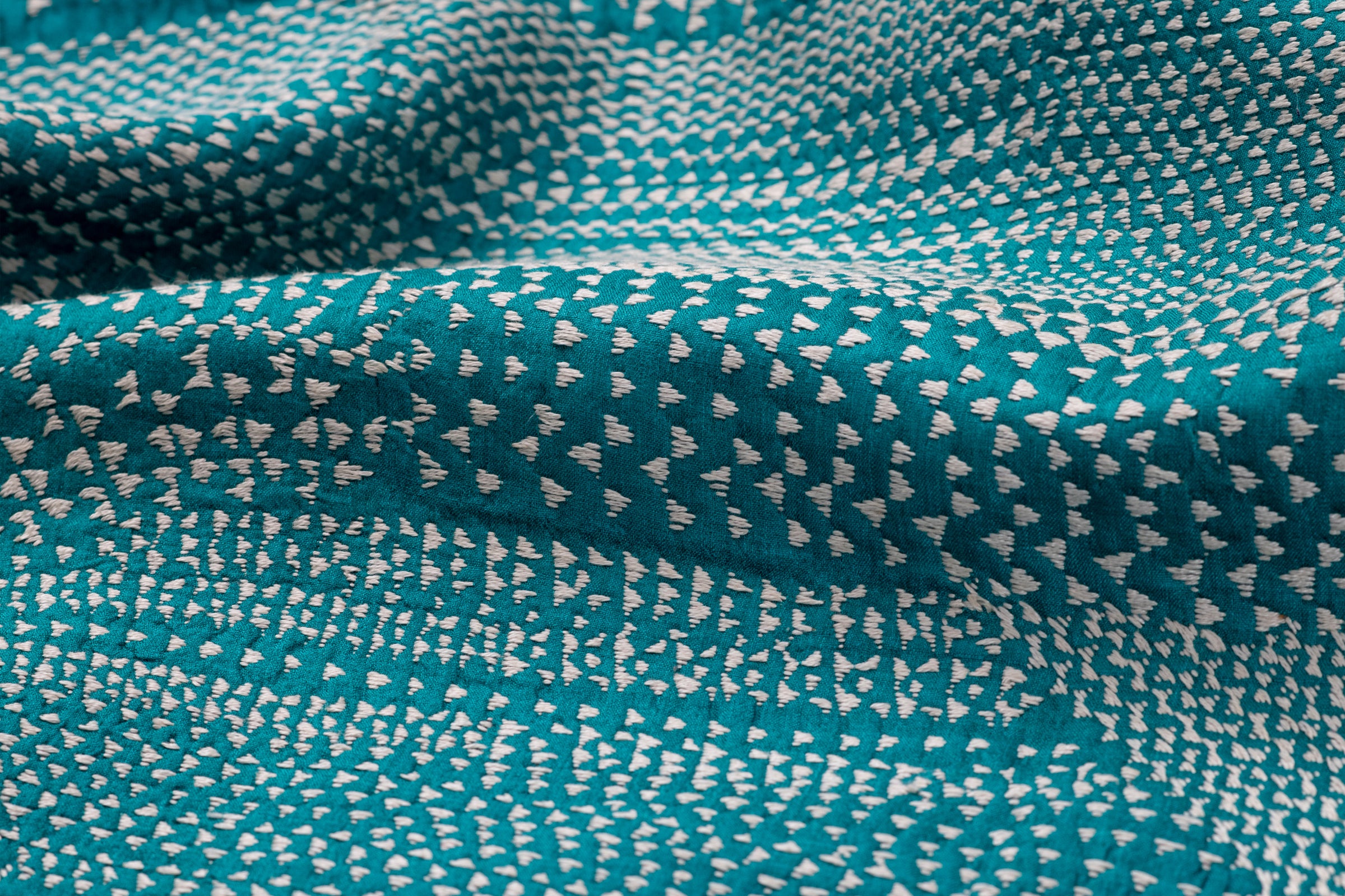 The cotton thread weaves a gentle structure through three layers of silk and cotton in shades of ivory and turquoise. Soft yet strong, supple and textured, the surface feels poetic—made to endure.