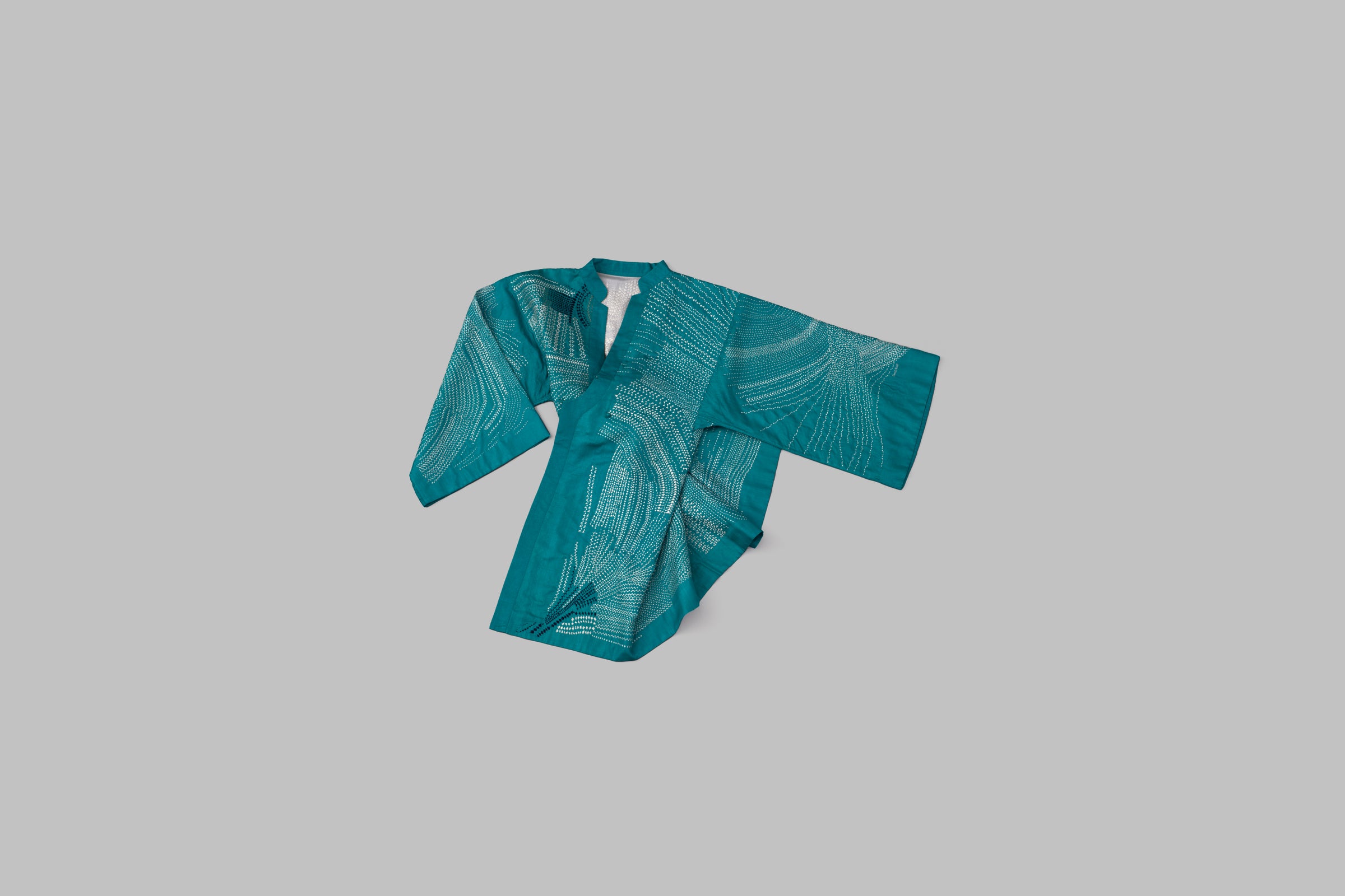 A modern, playful take on the kimono, this silhouette is easy, comfortable, and effortlessly stylish. Designed with long, wide sleeves and an overlapping collar, the textile carries a gentle weight that moves with quiet fluidity
