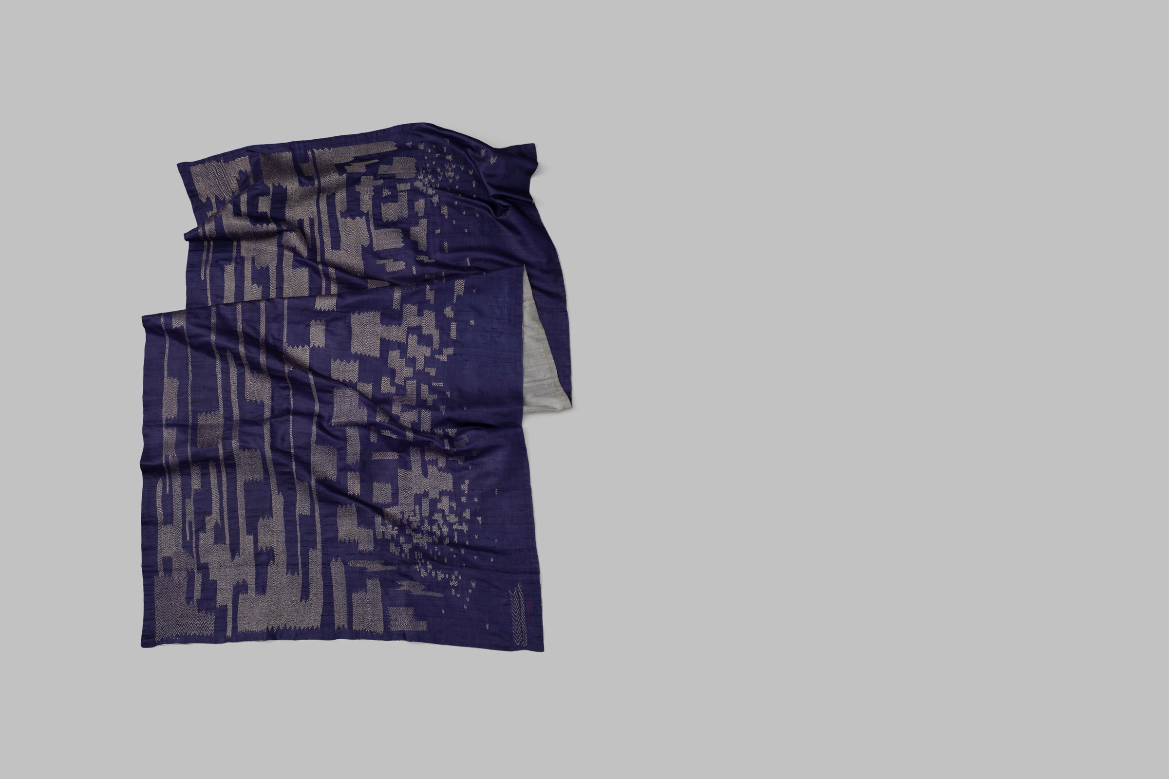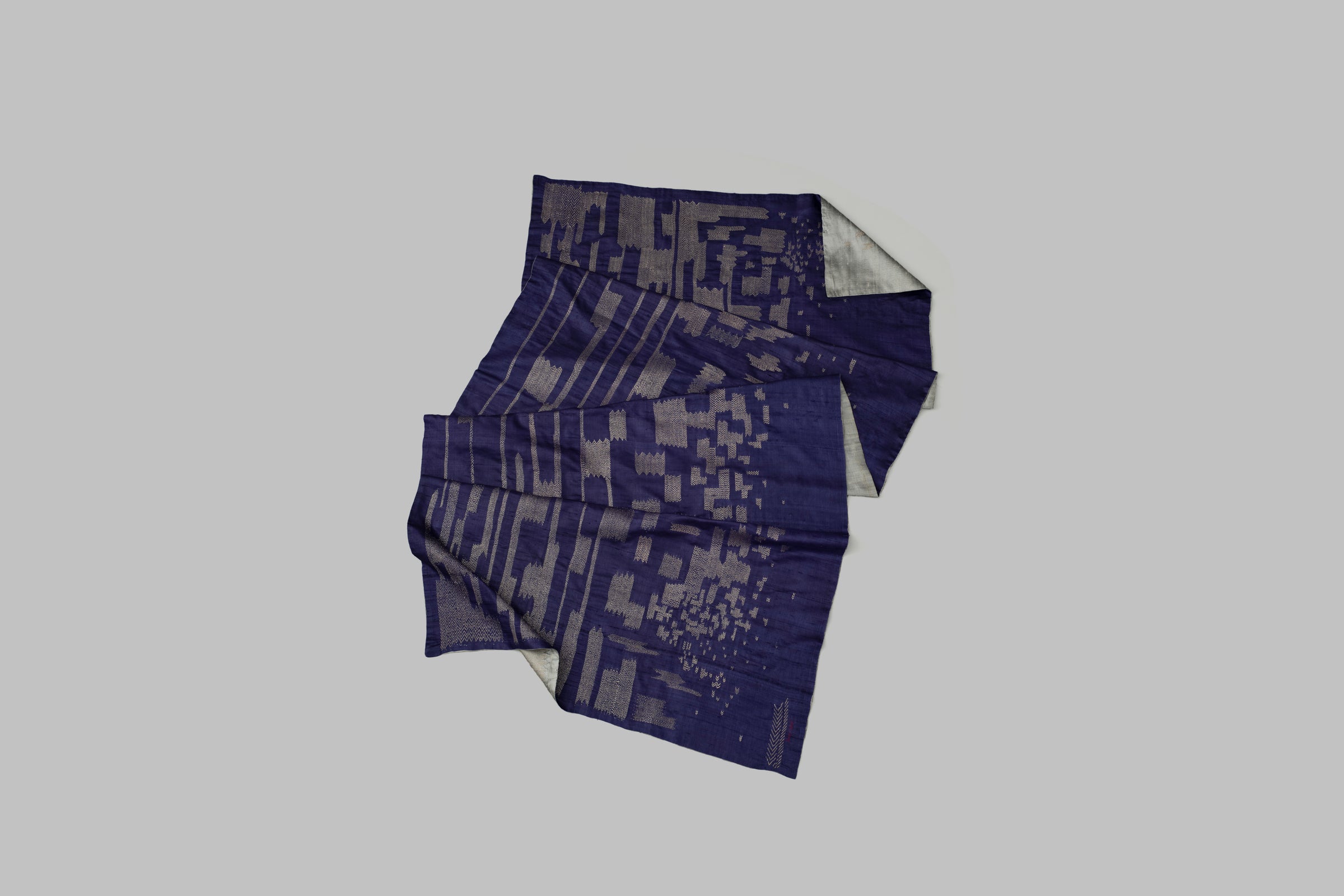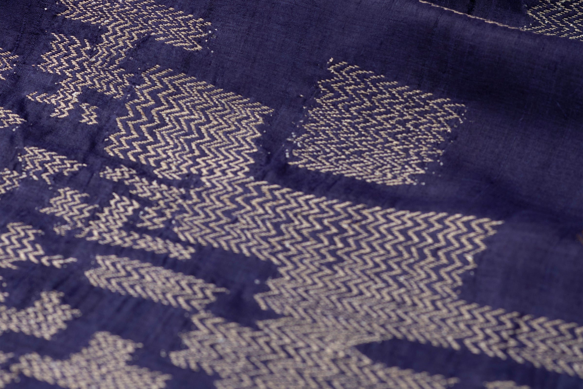 Layers of indigo tussar silk and silver dupion are meticulously embroidered with silver zari, extending across the serene expanse. Working with zari on tightly woven silk demands time, skill, and patience, making this piece a testament to artistry and dedication. The subtle interplay of silver zari on silver dupion is equally captivating, with every detail executed with precision and finesse.
