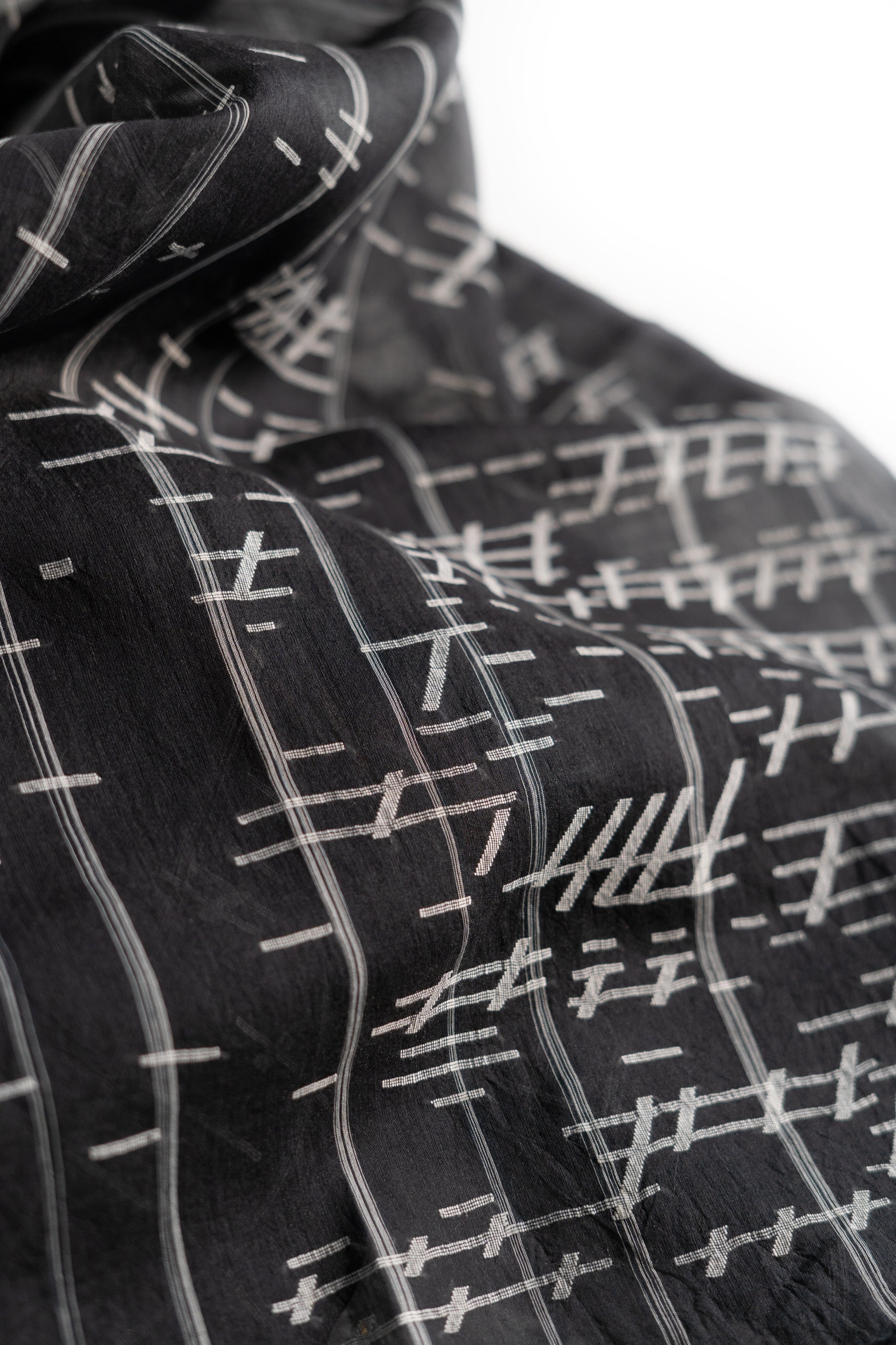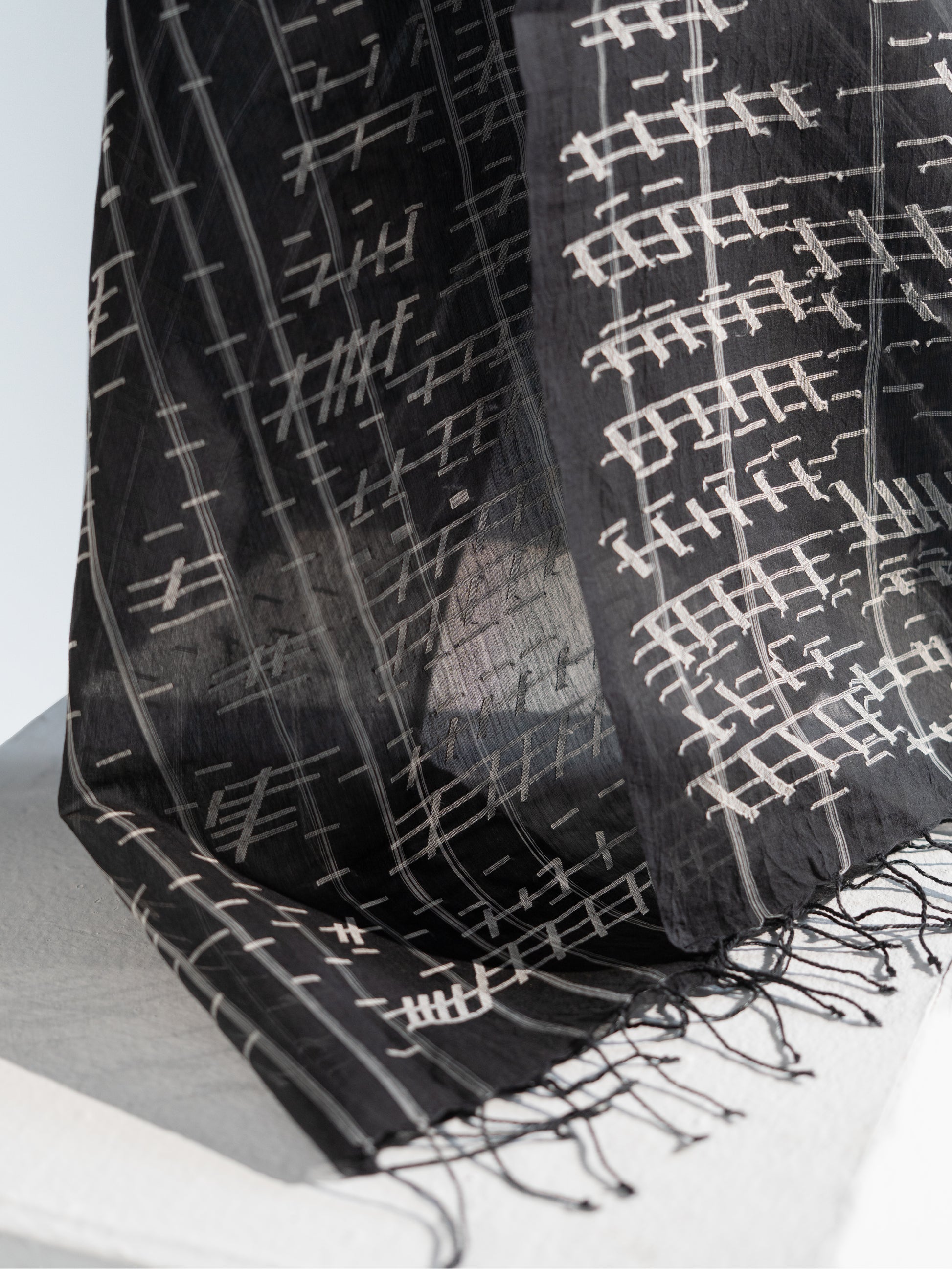 This stole unfolds with abstract Jamdani motifs drifting across a whisper of ikat, guided by gentle asymmetries. Hand woven in silk and cotton, it is feather–light yet full of presence, cascading in a graceful fall.