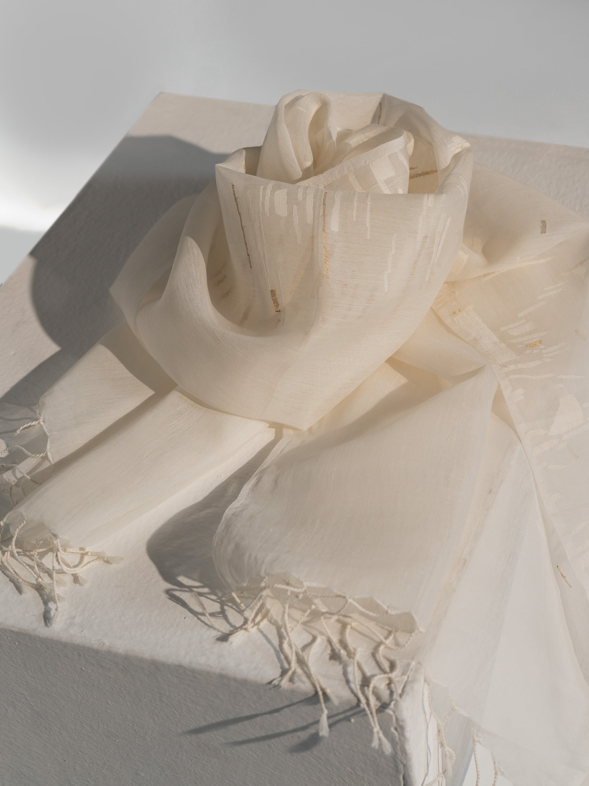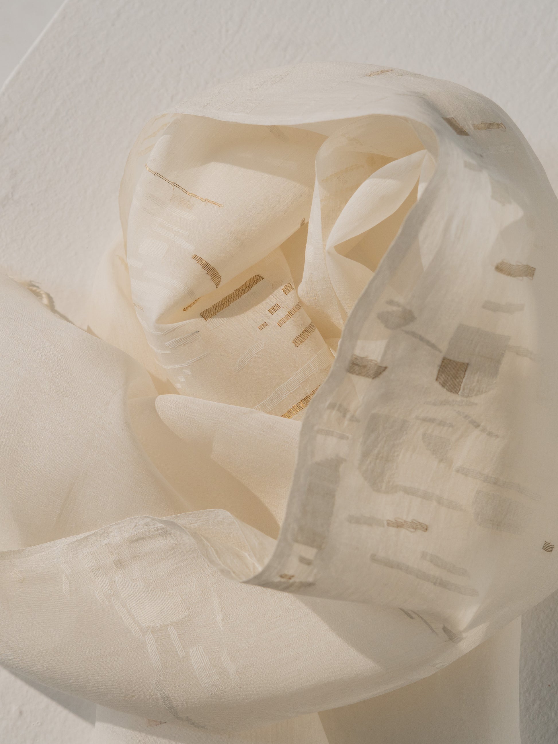The stole is shaped by poetic asymmetries in tone-on-tone ivories, with subtle accents of gold, radiating both warmth and elegance. Hand woven in silk and cotton, it is feather–light yet full of presence, cascading in a graceful fall.
