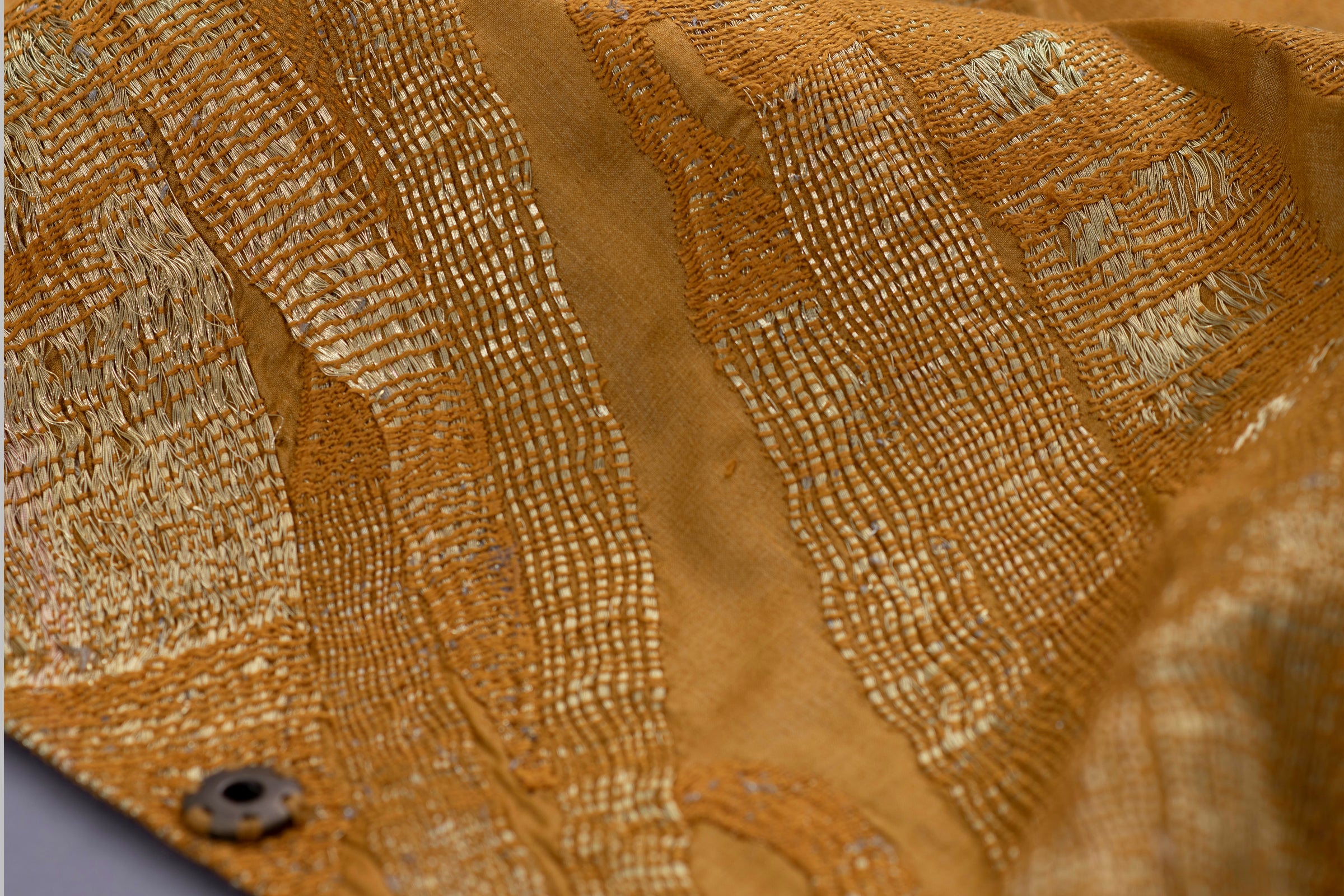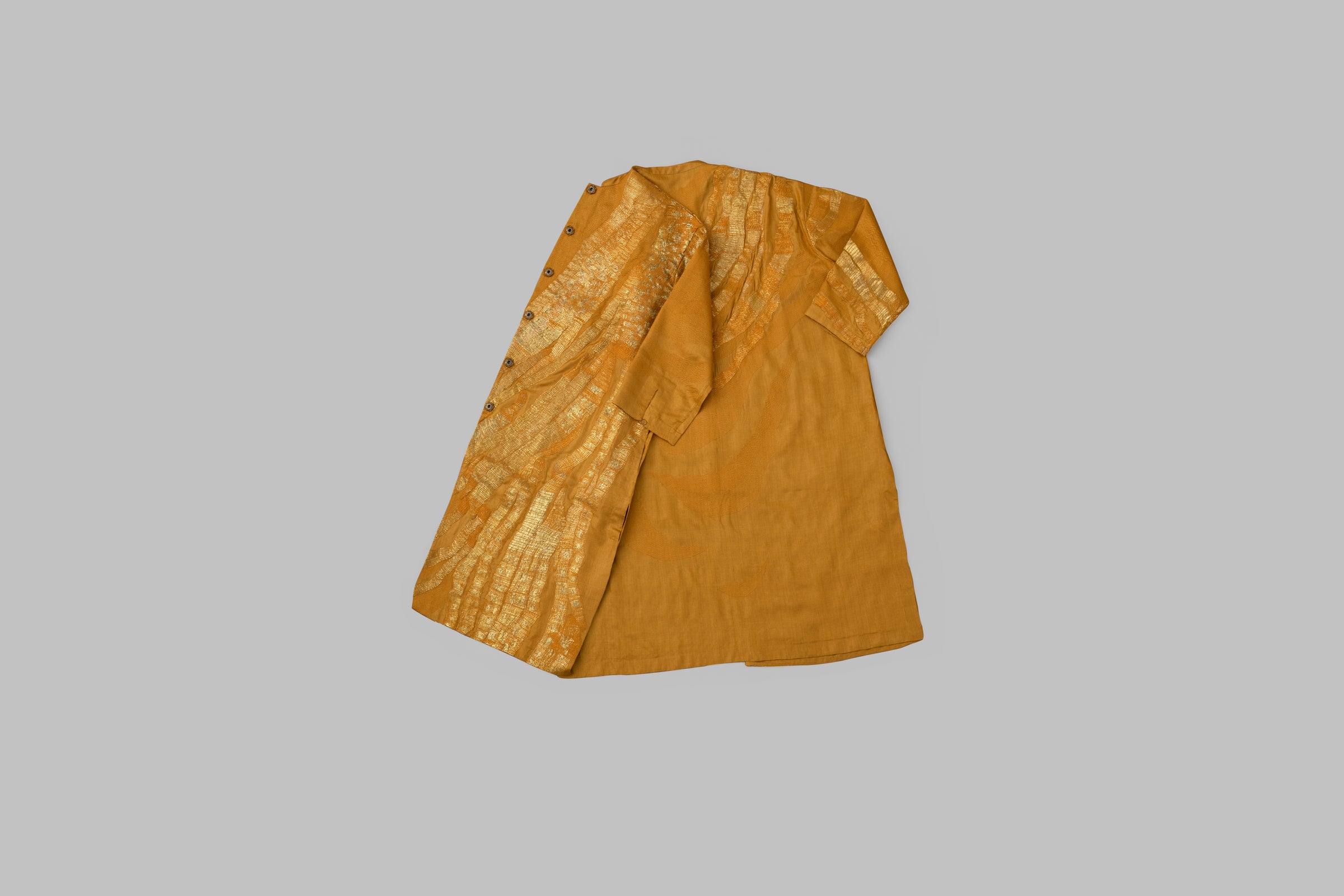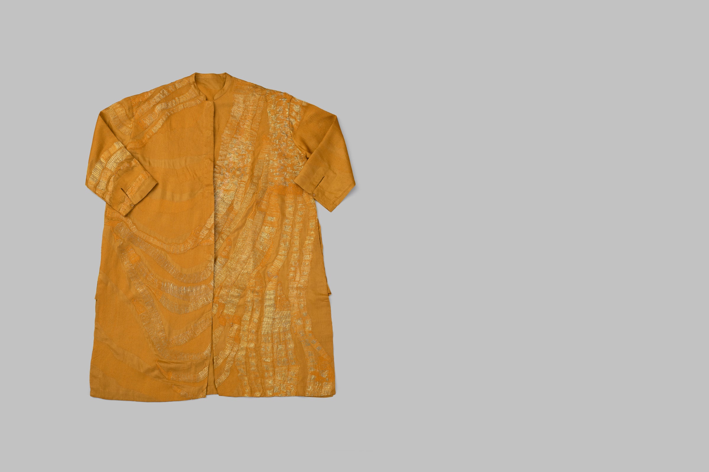 Two layers of warm mustard tussar silk, embroidered with golden zari and mustard thread, create a rich tonal surface that feels at once sculptural and ornate.