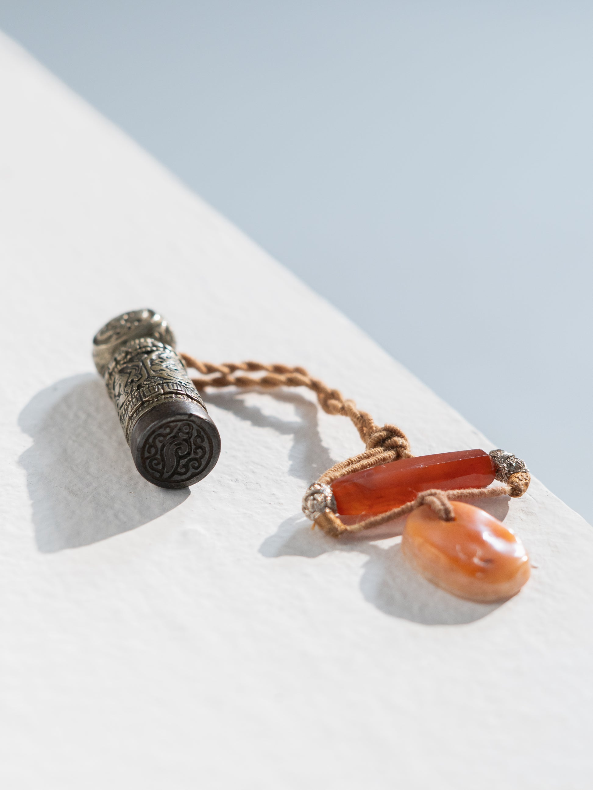 A string decorated with semi-precious stones is attached to the stamp for convenient handling.